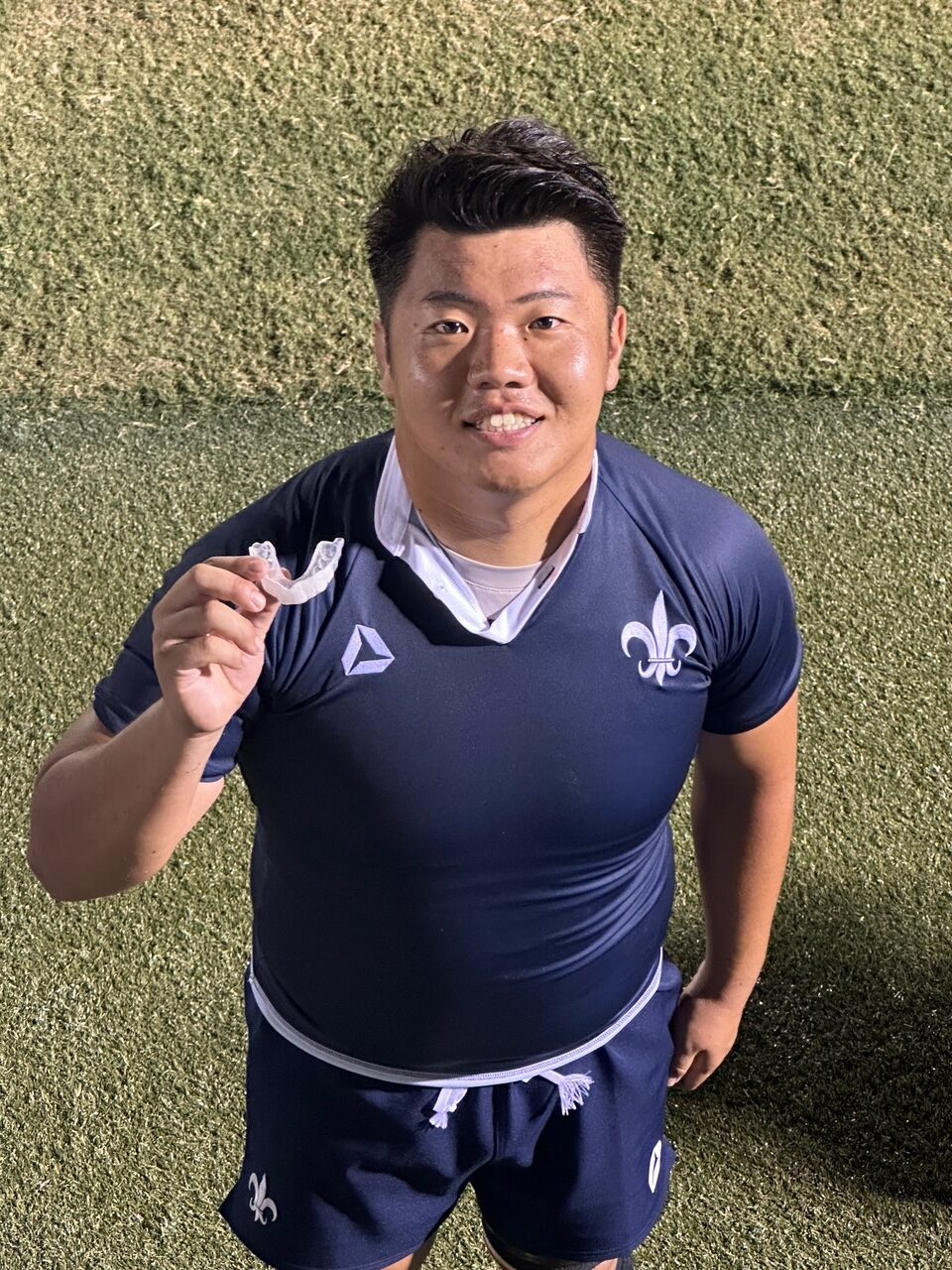 ポジションがフォワードのプロップということから、前歯部をしっかり被覆し、タックルやスクラムで負荷がかかる臼歯部はバックスの選手より1ミリ厚くしています。